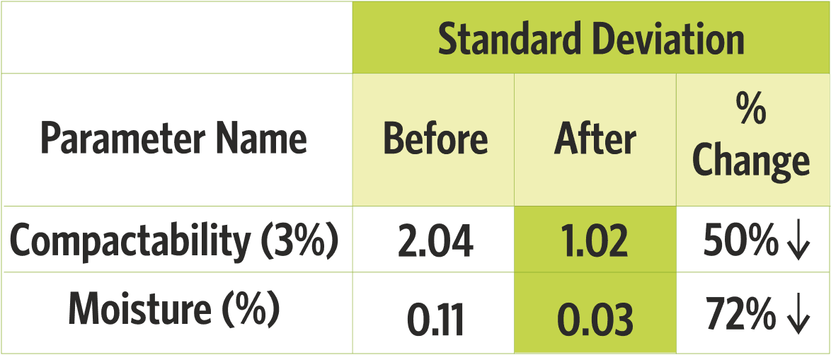 Standard deviation is reduced for Compactability and Moisture by more than 50% after implementation where is running, compared to the period before implementation.