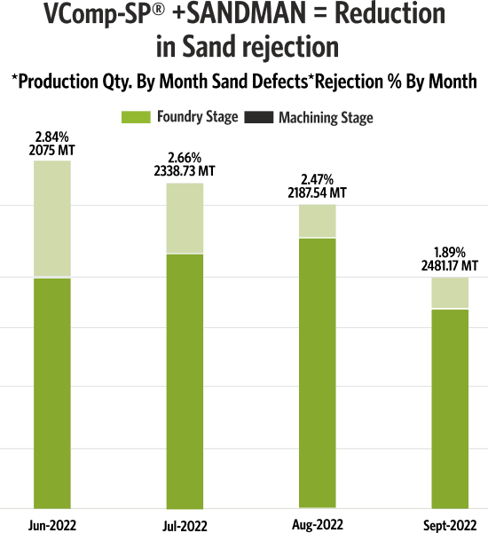 The successful implementation of Sandman VComp-SP® resulted in improved rejection rates and enhanced operational efficiency for the foundry. The precise control over moisture and Compactability, combined with the variable set-point prescription, significantly reduced casting defects and enhanced overall quality.