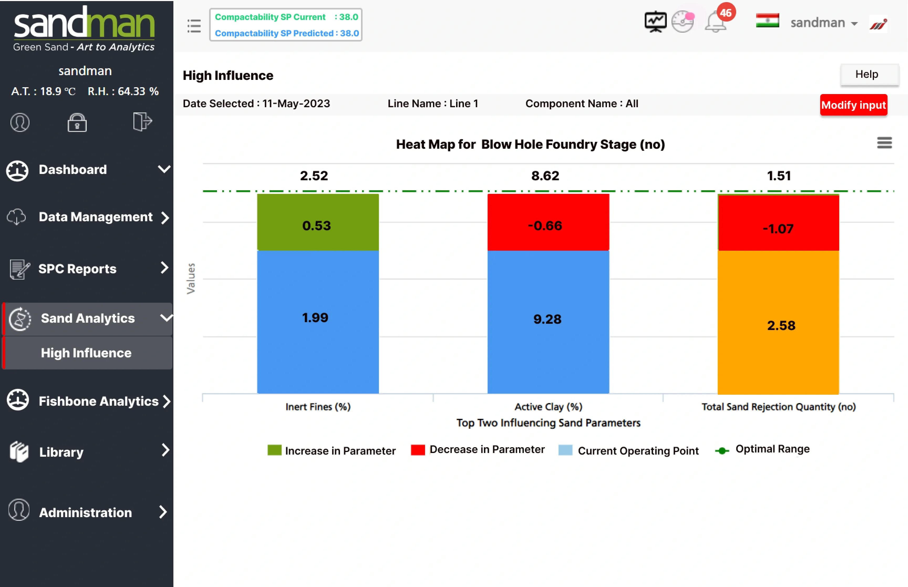 By employing advanced machine learning algorithms and sophisticated mathematical models, SANDMAN's High Influence algorithm analyses and forms multivariate correlation of the sand properties, identifies the most influential parameters on the casting rejections at a point in time of user choosing, and provides actionable control guidance to minimize rejections.