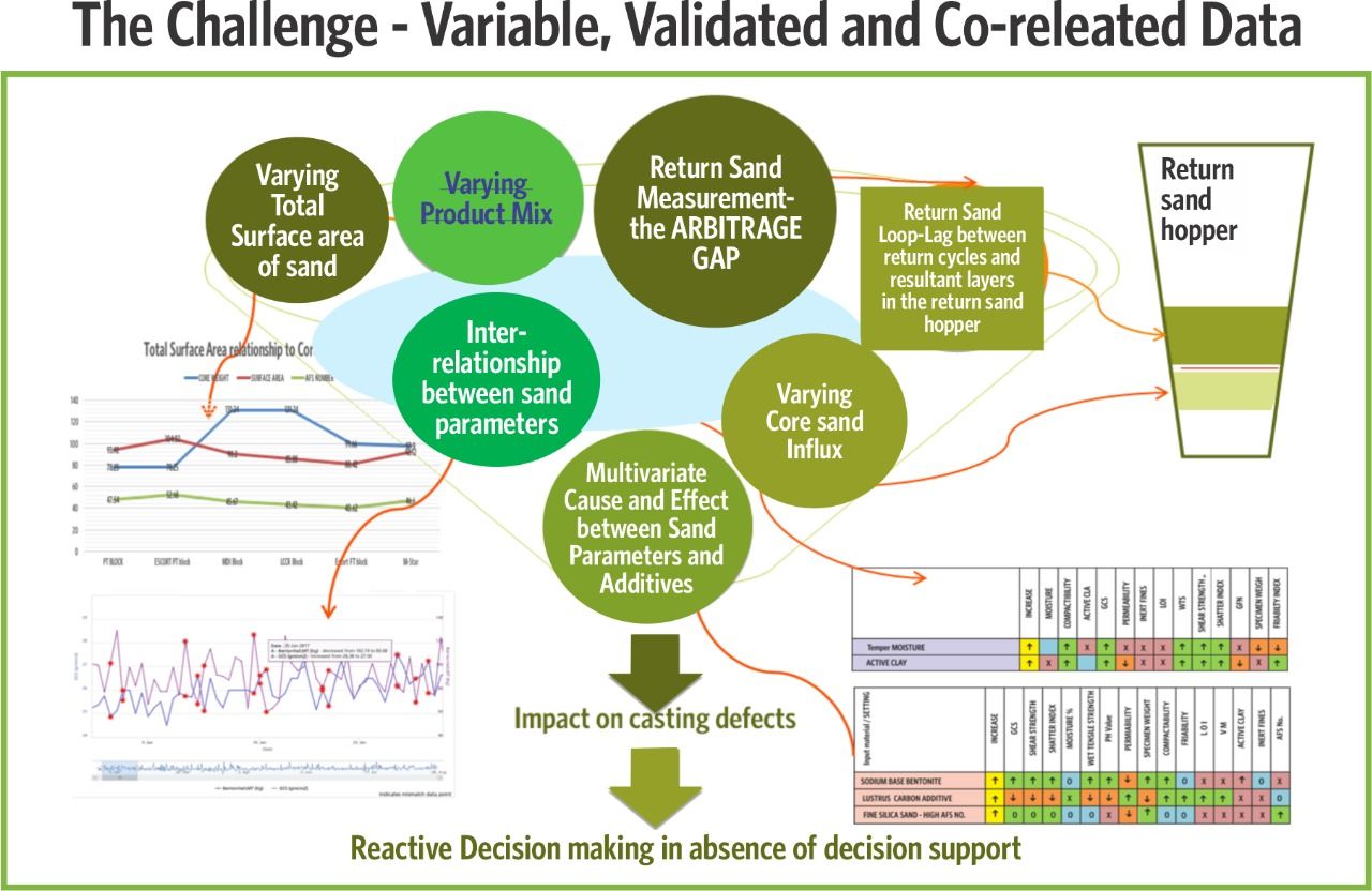 This addresses the global foundry process owners' unmet need to target variable, 'dose-by-need' additions of sand additives instead of the fixed dose additions based on pattern changes and consequently significantly reduce return sand variability. The variable, multi-variate analytics using our unique SANDMIX algorithm, translates the optimal sand properties and prescribes a sand recipe for each new group of patterns correlated to the rejections.