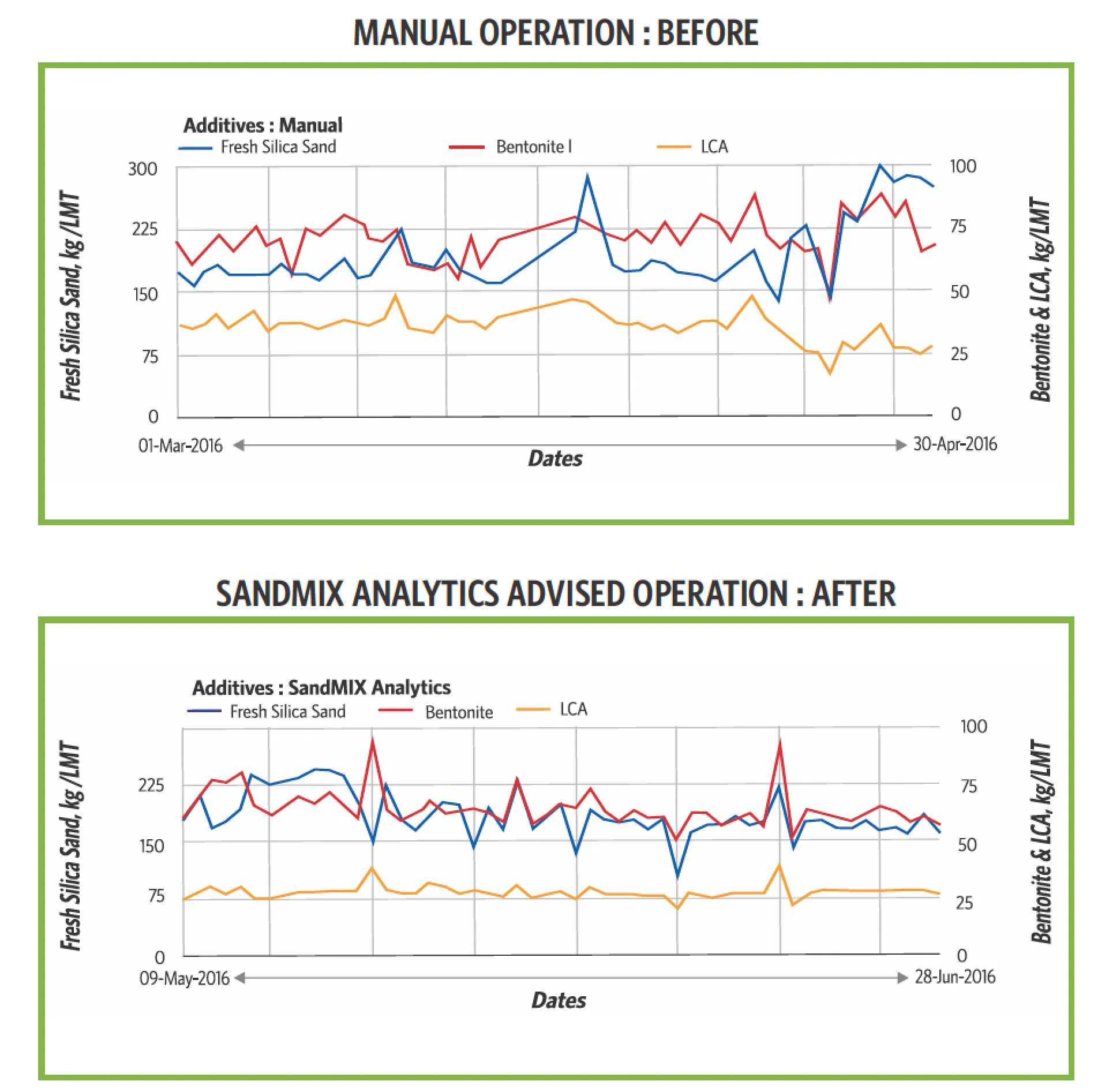 Variable, dose-by-need prescriptive analytics also helps reduce the consumption of costly additives such as coal dust, bentonite and raw silica sand by optimisation of the sand loop.